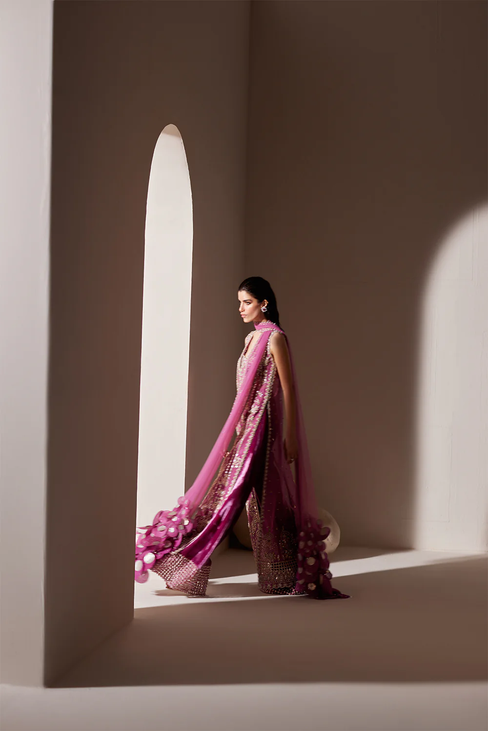 Verdant is a luxurious organza bodacious jacket with a sleek silhouette, paired with a stunning geometrically embellished velvet inner. The ensemble is completed with matching velvet pants featuring intricate geometric patterns along the hem. The matching dupatta features chic circular applique finished with beads and gems for an added touch of glamour.